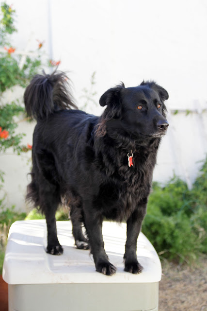 After playing hard at catch, Shado jumps up on the storage trunk in the back quadrant of the garden.